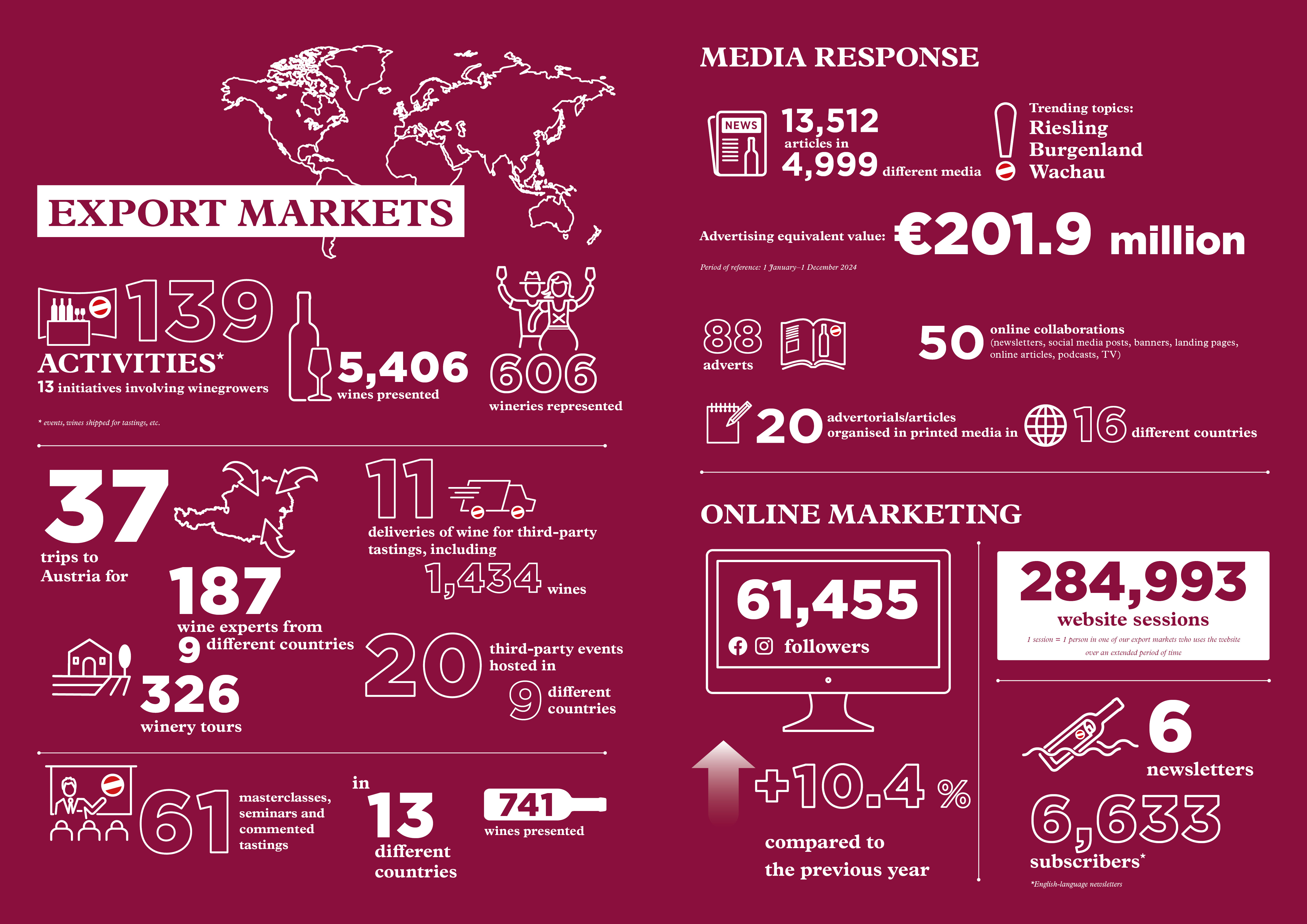 Cela comprenait un total de 148 événements, lorsque plus de 6 000 vins de 980 vignobles autrichiens ont été présentés. La plupart des événements ont eu lieu à l'étranger, soulignant le rôle stratégique des exportations.